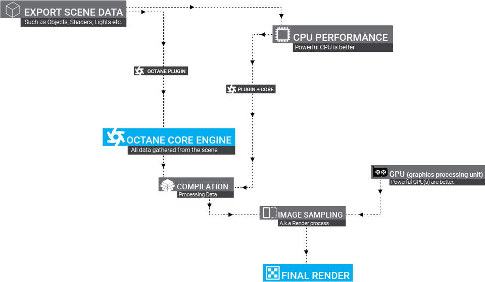 当您使用 OctaneRender ®开始渲染时,第一步是收集场景中的所有数据并将其发送到 Octane 核心引擎。尽管 Octane 是一个 GPU 渲染器,但 CPU 在这个过程中仍然扮演着重要的角色,那就是在场景数据的编译中。快速的 CPU 将缩短场景导出时间和编译过程。一旦 Octane Core Engine 中的场景数据得到处理,编译过程就会开始(如 Cinema 4D 主界面左下角的全局状态栏显示中的“准备”显示所示)。完成此操作后,GPU 接管该过程并开始“图像采样”,最终将生成最终渲染。下图说明了该过程: