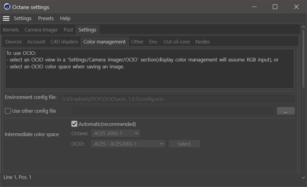 除了 OCIO 支持之外,ACEScg 现在可用作导出单帧和使用批渲染时的内置色彩空间。计划在以后的版本中支持导入不同颜色空间(包括 OCIO 颜色空间)的图像纹理。