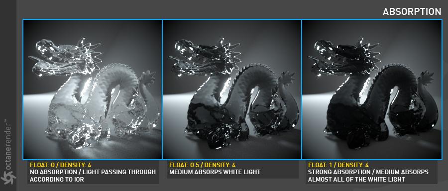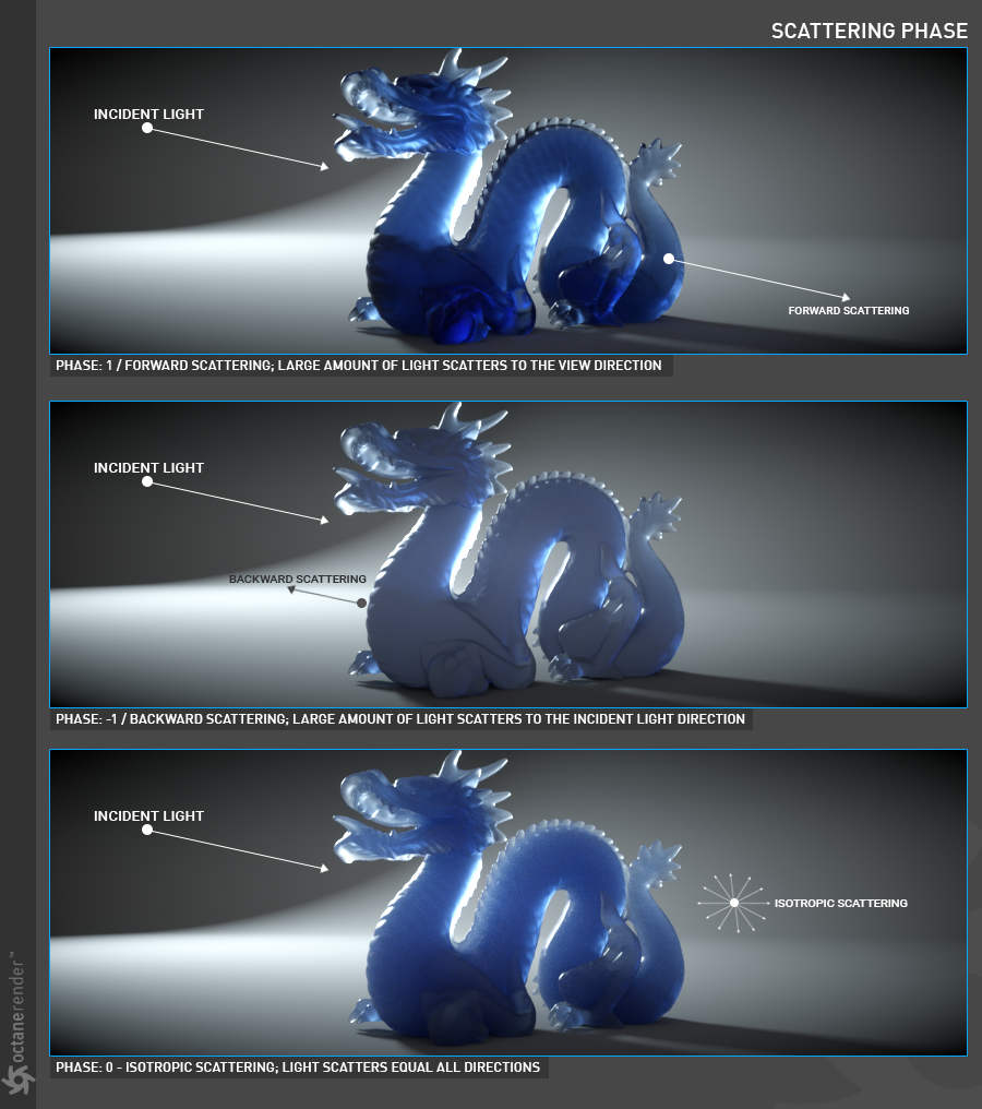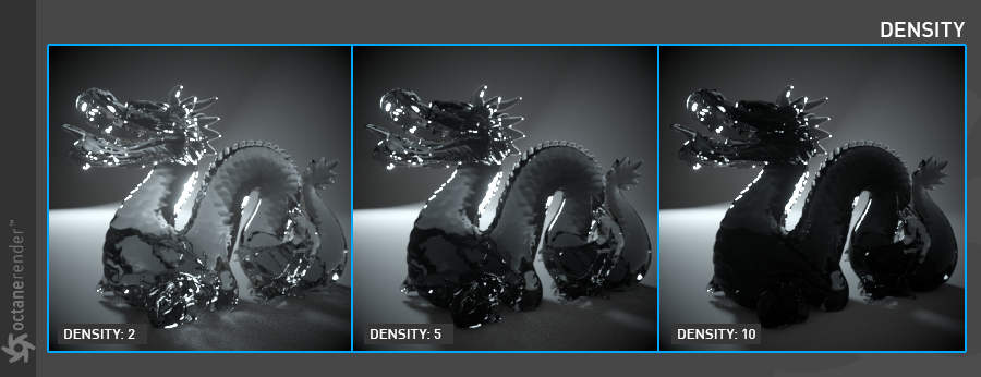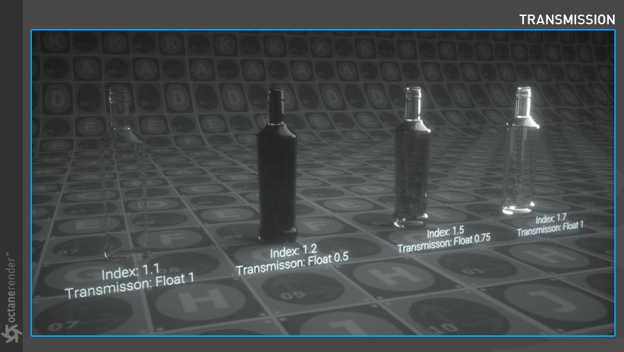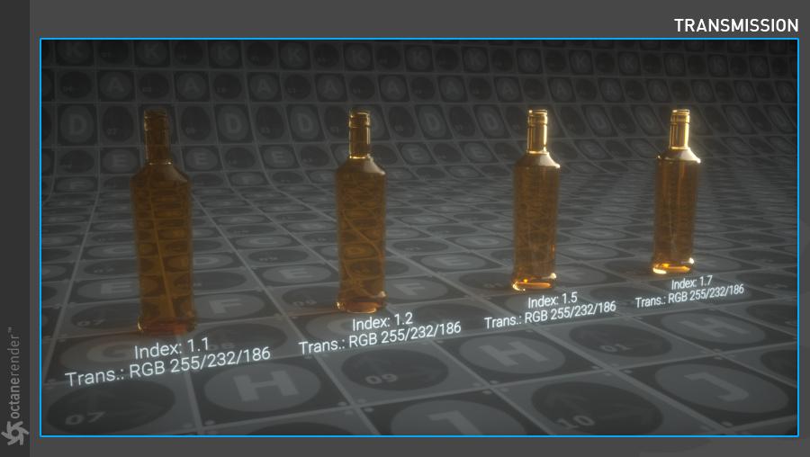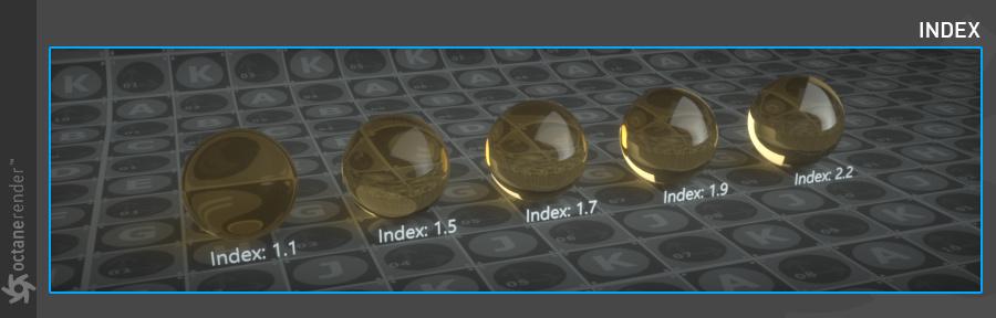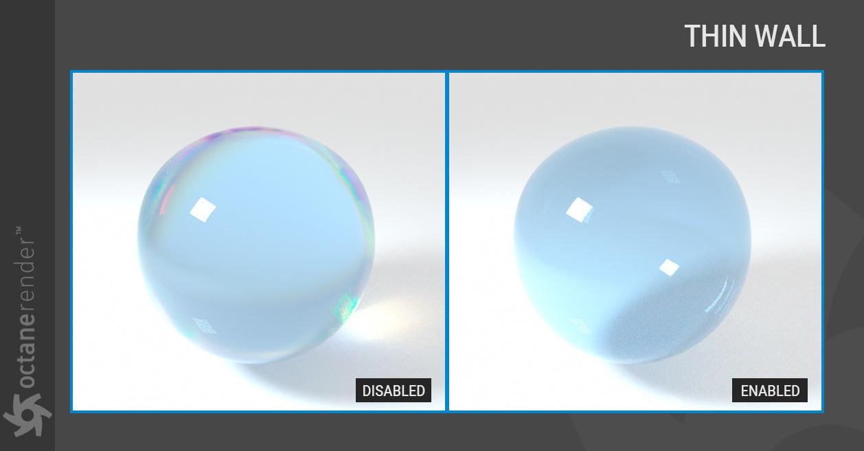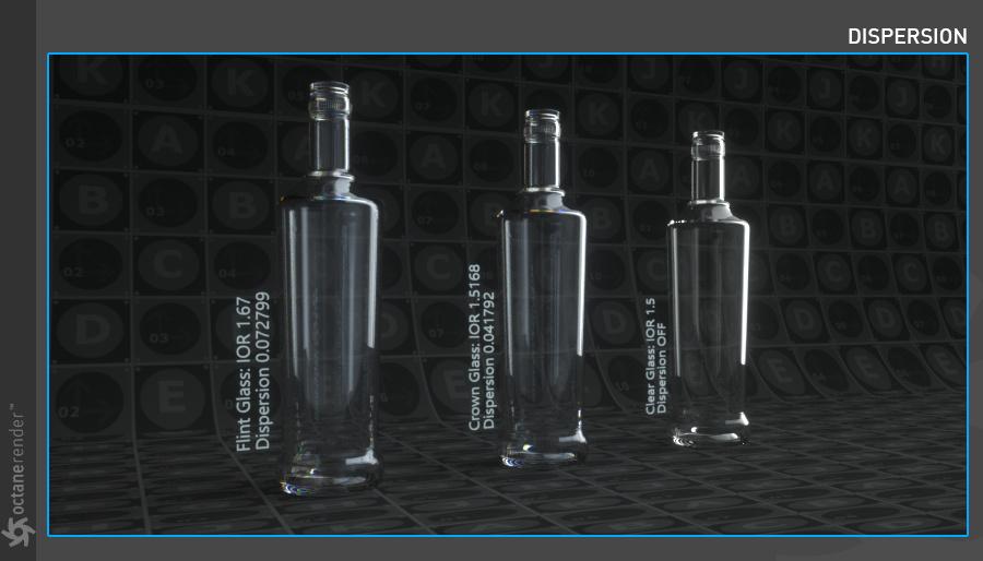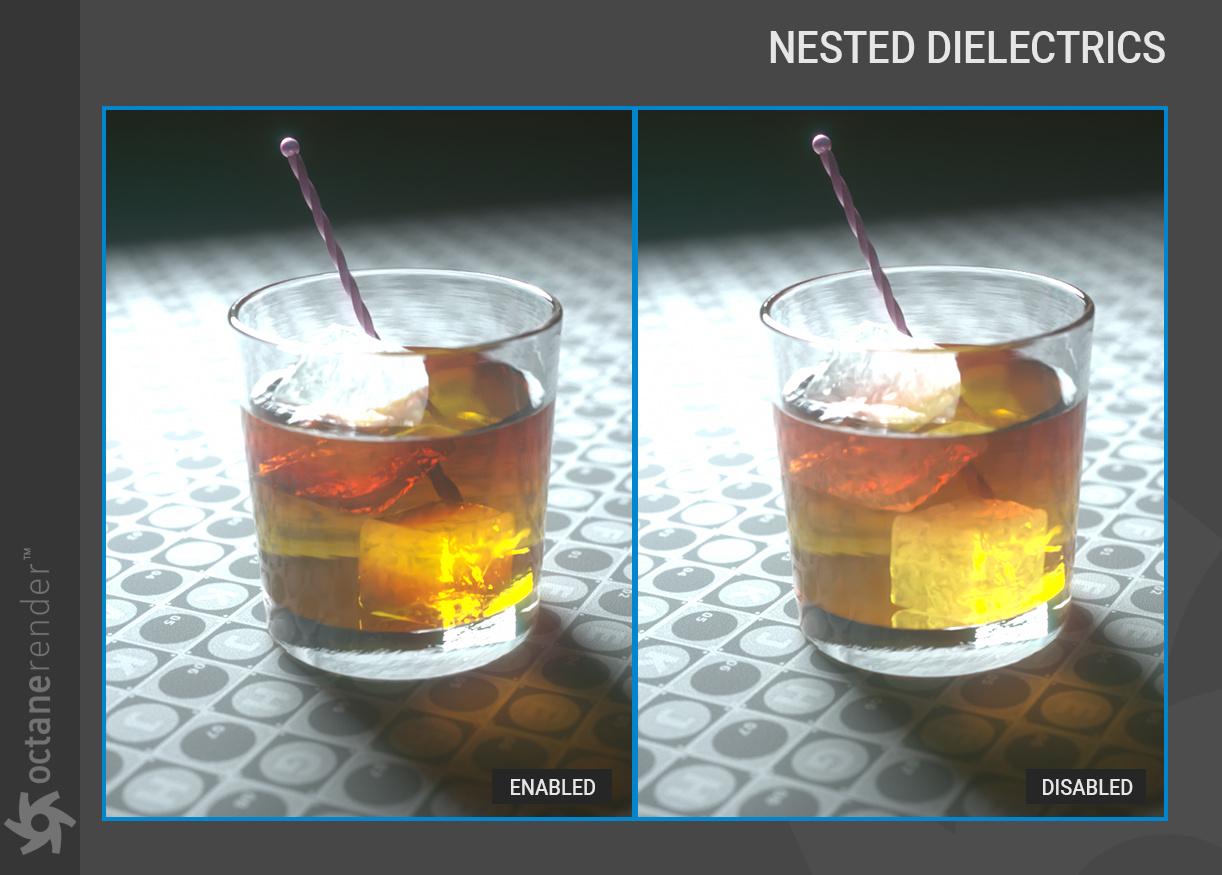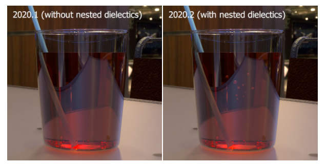 以下示例显示了使用嵌套电介质渲染液体中的气泡。凭借沿光线路径跟踪 IOR 的能力,它维护了一个已知 IOR 列表,可用于更准确地计算表面之间的界面变化。在这个例子中,以前的 Octane 版本会忽略 1.0 IOR 的气泡,2020.2 会发现全内反射反弹以反射气泡,因为我们尝试从 1.3 IOR(液体)到 1.0 IOR(气泡) .