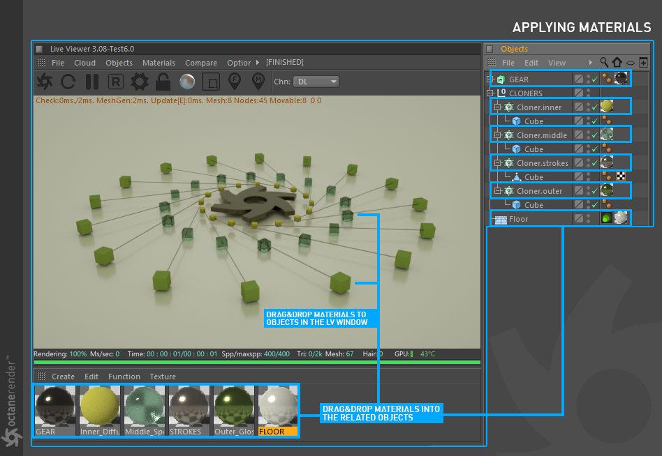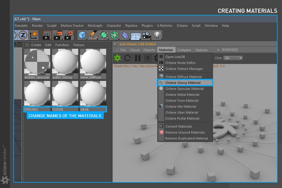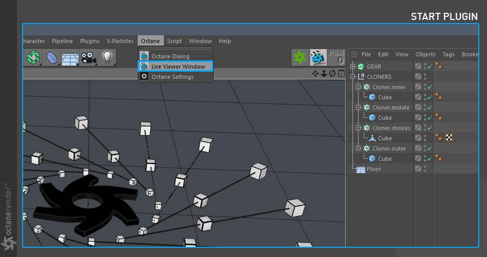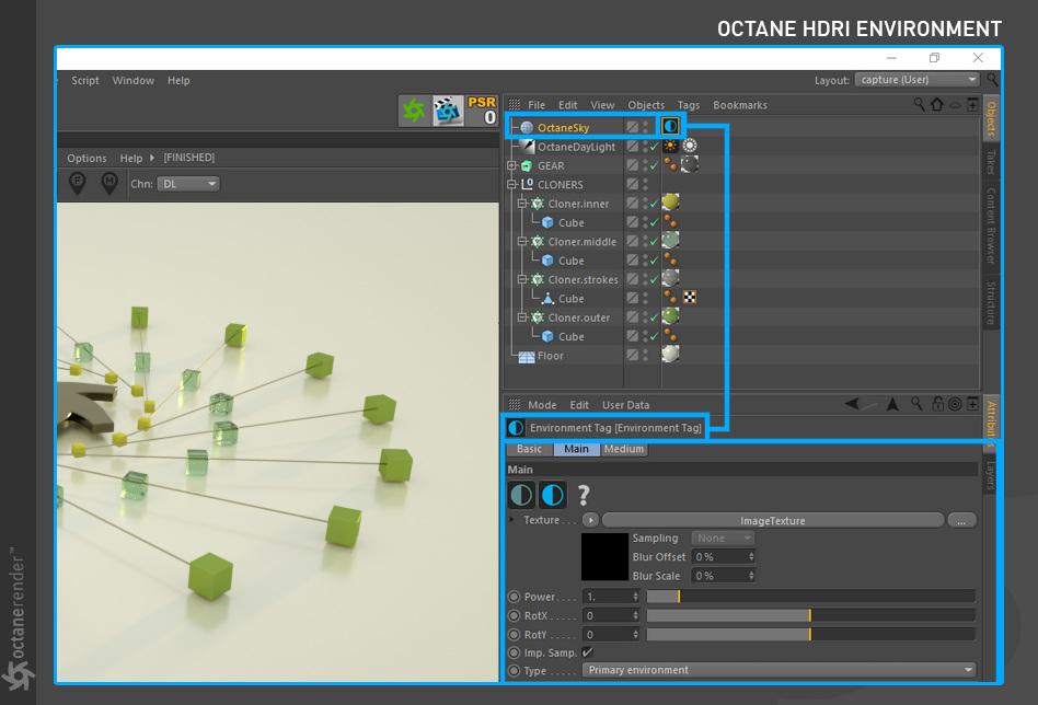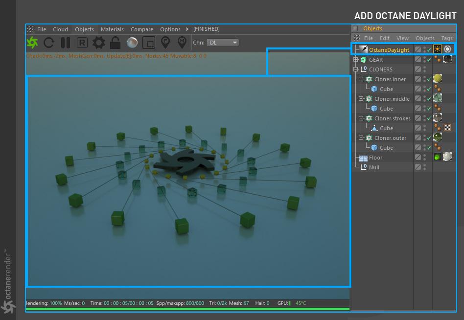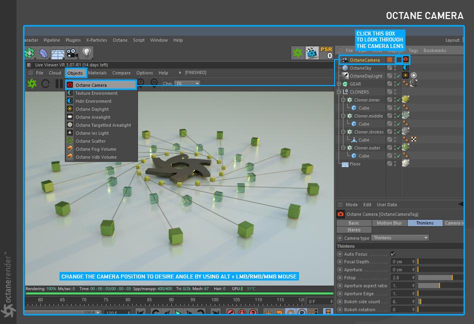 要使用 Cinema 4D 的 OctaneRender 进行渲染,请遵循典型的工作流程:
