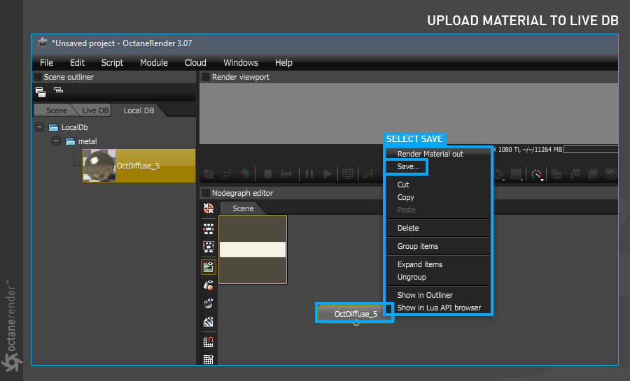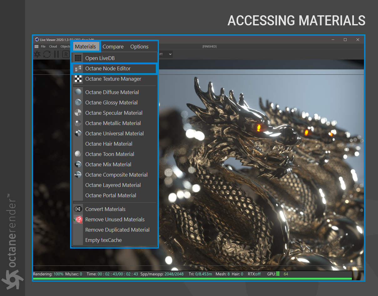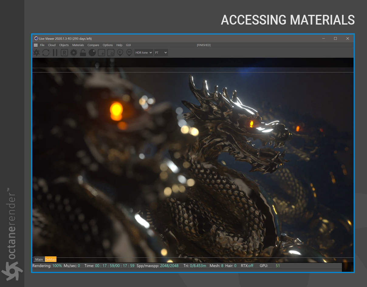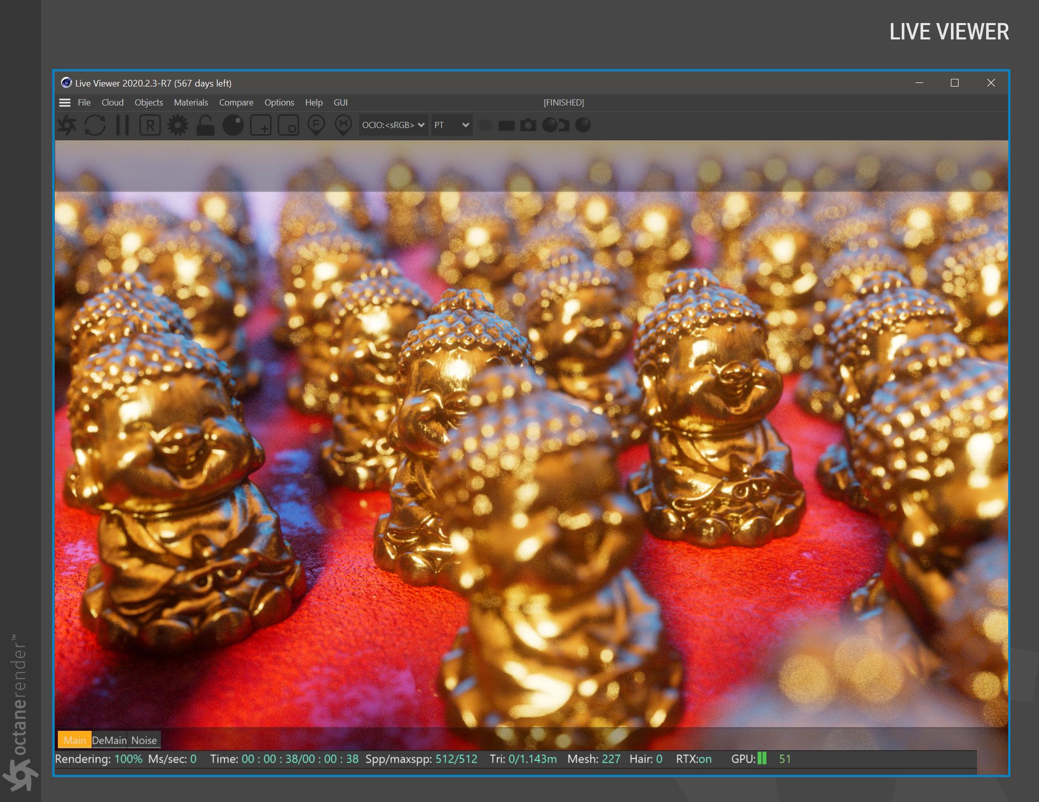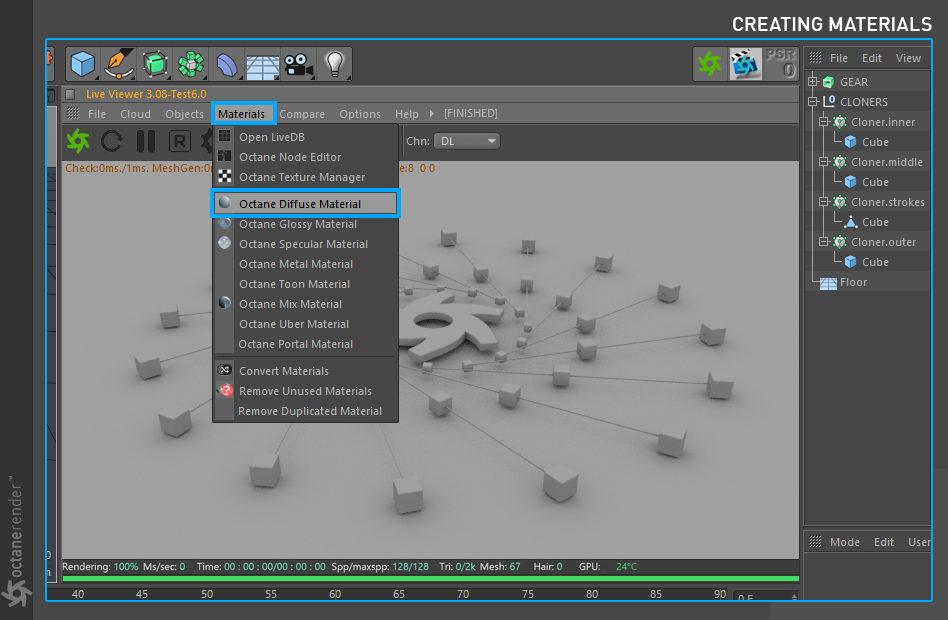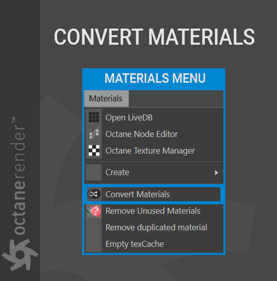 电影材质需要由 Octane 即时转换,而这种转换需要时间——在某些情况下,需要很多时间。转换发生,然后每一帧都加载到您的 GPU 卡上。幸运的是,Octane 可以根据需要将这些材质转换为 Octane 格式,方法是打开 Live Viewer 并在 Live Viewer 菜单栏中选择材质 > 转换材质。