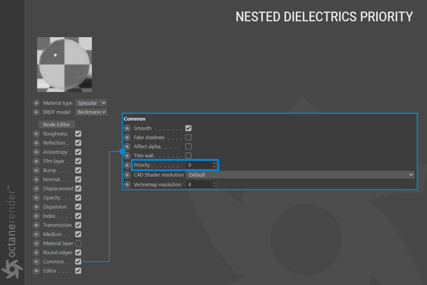 此外,为了解决重叠表面的模糊性,我们引入了表面优先级控制,以允许艺术家控制表面的优先顺序。较高的数字表示表面材质的优先级较高,这意味着如果光线进入较高优先级的表面,然后在较高优先级的表面介质内与较低优先级的表面相交,则它优先于较低优先级的表面材质。