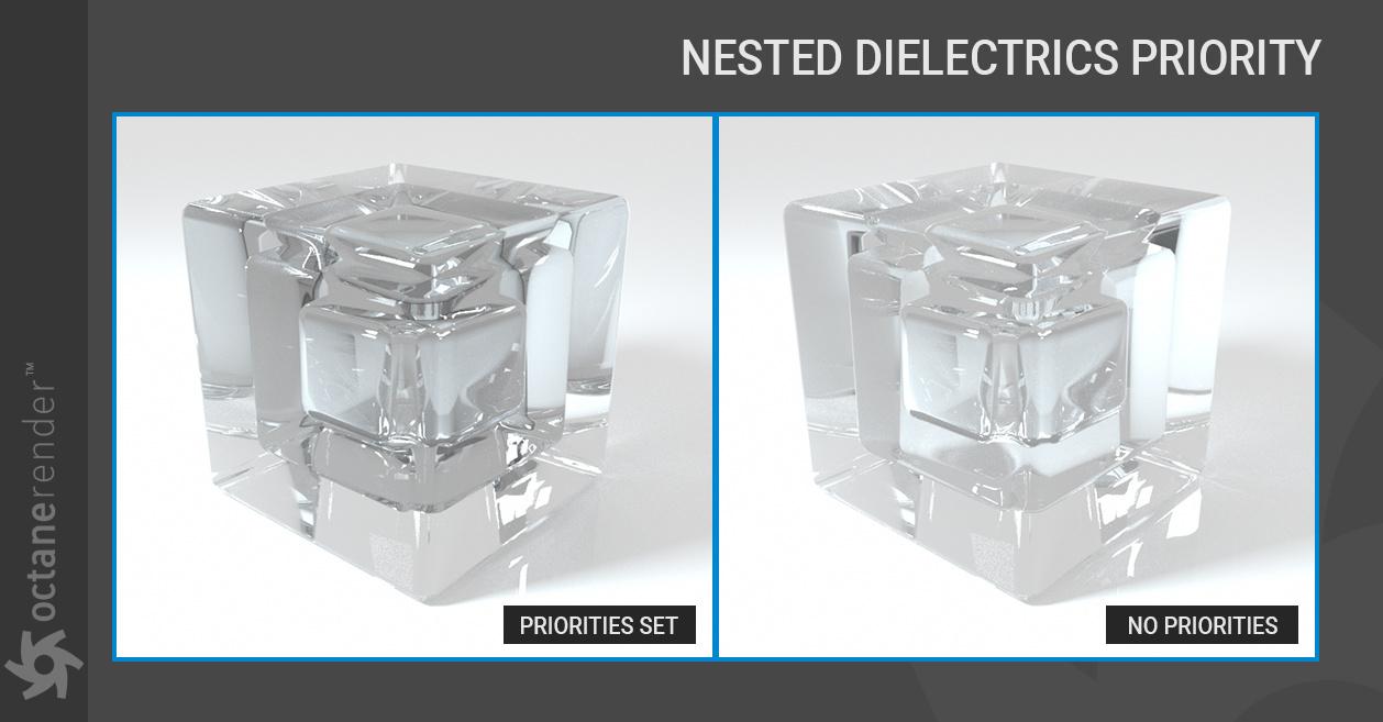 我们通过跟踪对象内部的 IOR 改进了电介质的渲染。这允许准确模拟 IOR 并提高 IOR 高于 1.0 的界面内镜面反射的真实性。