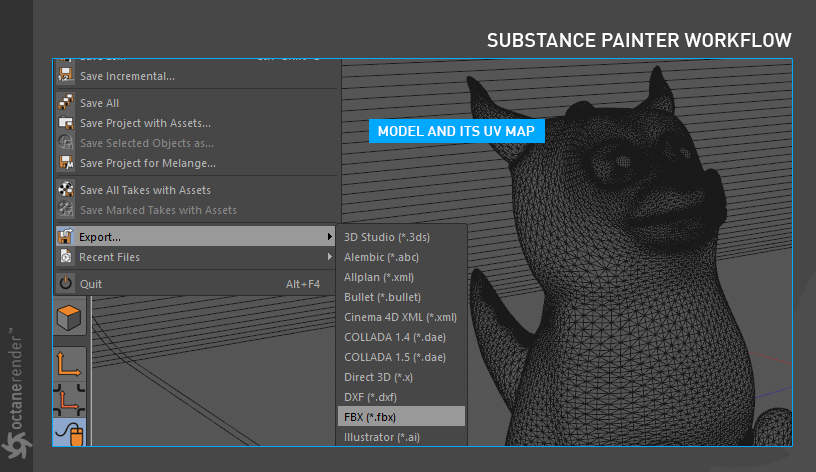 一旦您决定使用 Octane Standalone 或 RNDR,您需要将场景发送到 Octane Standalone 才能开始。为此,请打开 Live Viewer 并启动您的场景,以便您可以在 Live Viewer 中看到它。一旦您可以看到您的场景(如果您愿意,可以暂停),从 Live Viewer 菜单栏中选择 File > Export to…。从选择此选项时出现的弹出菜单中,您可以选择: