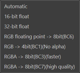 确保正确设置每个图像纹理的贴图类型。auto 函数会尝试猜测,但对于灰度或 alpha 图像,最好专门设置 Map 类型值——这样,只分配该图像实际需要的 VRAM,而不是更多。如果 VRAM 已分配,但未使用,则只是浪费。