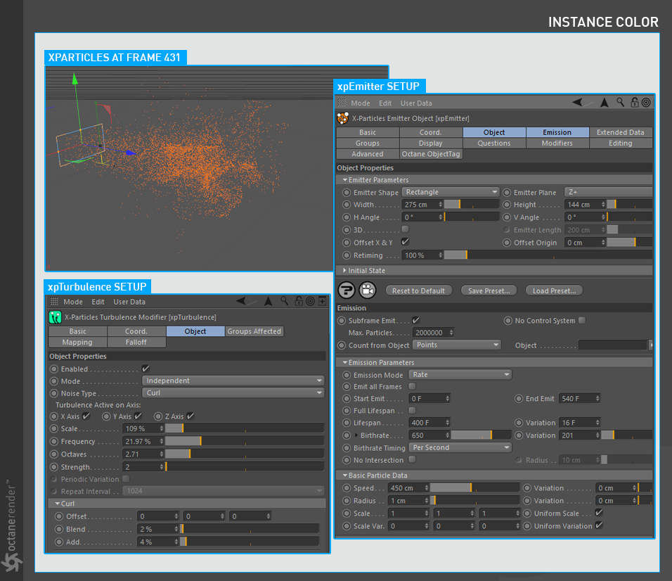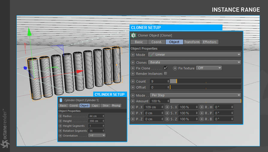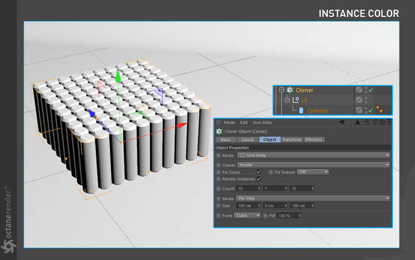 如果克隆是动画的,您可能会看到运动模糊条纹。当克隆从无运动开始然后“跳”到某个位置时,就会发生这种情况。该跳跃被注册为对数据记录的转换,Octane 将使用运动模糊渲染该运动(假设您启用了运动模糊)。