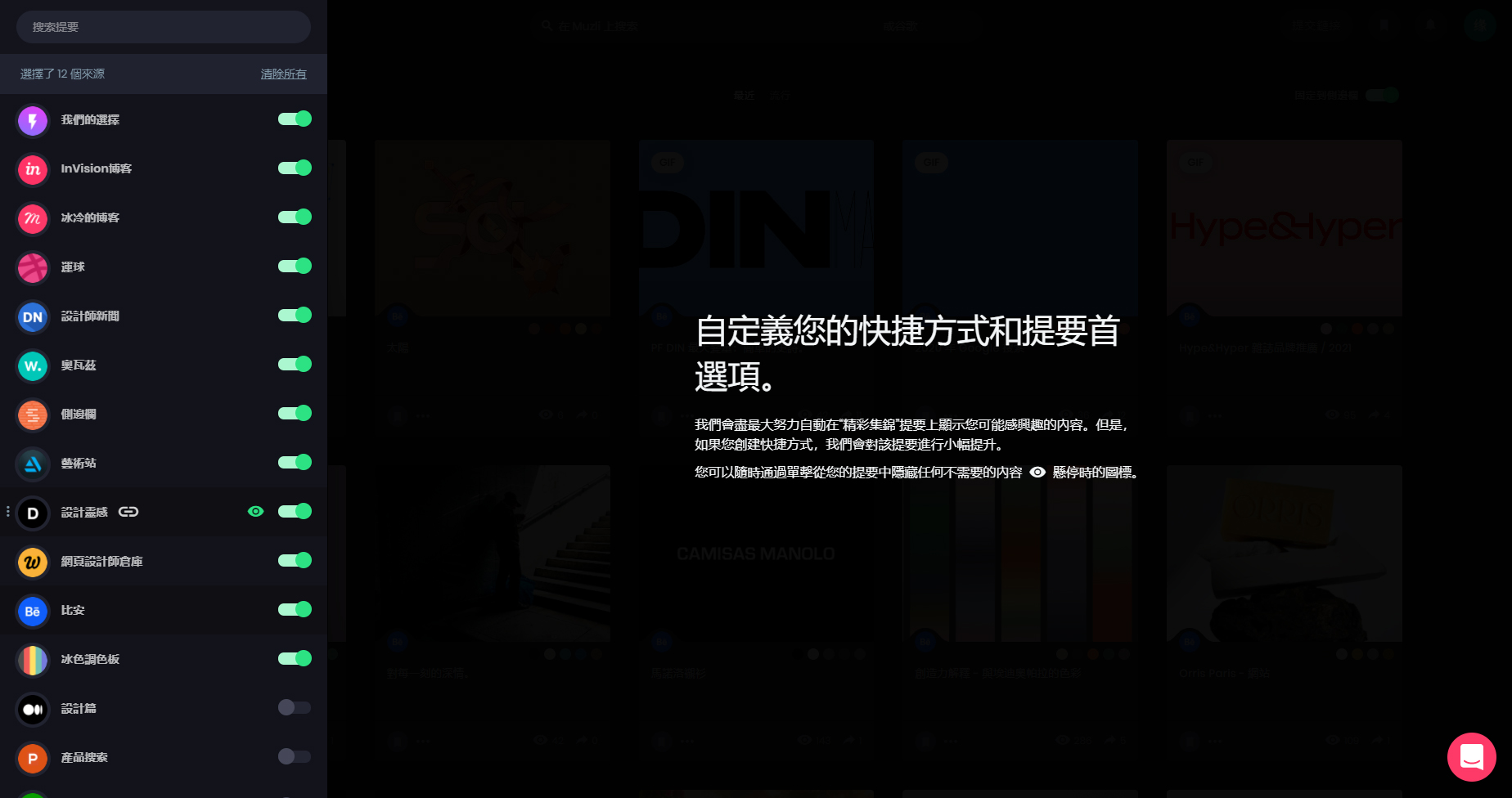 点击左下角,铅笔图标,进入编辑,可以选择自己喜欢的灵感网站,点击绿色开关即可。